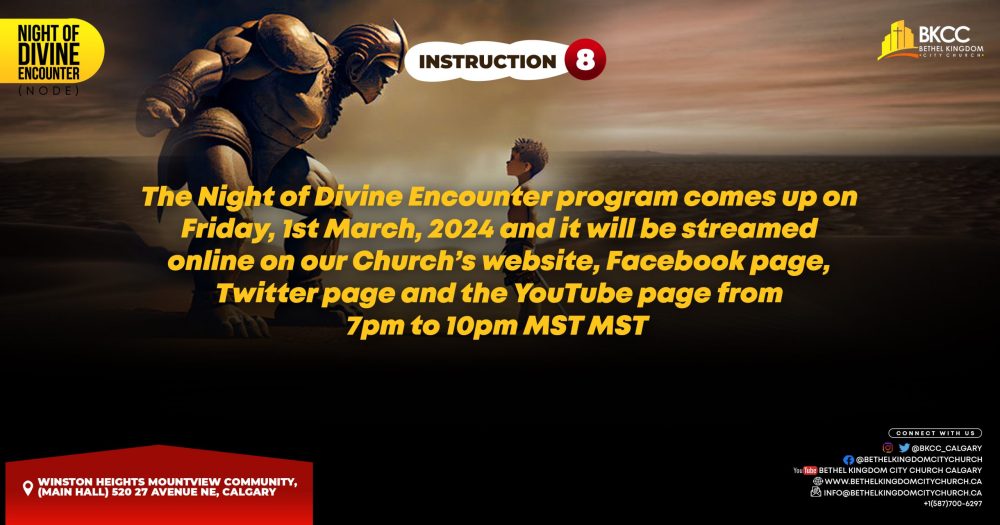 To be a part of the corporate prayers, Early Morning Cry, stream live on our website from 24th February to 1st March 2024 from 5am MST to 6am MST. Also join us online between 7 pm -10 pm MST on Friday, 1st March, 2024 for our Night of Divine Encounter through our Church’s Website or through our Facebook, Twitter page or YouTube channel.